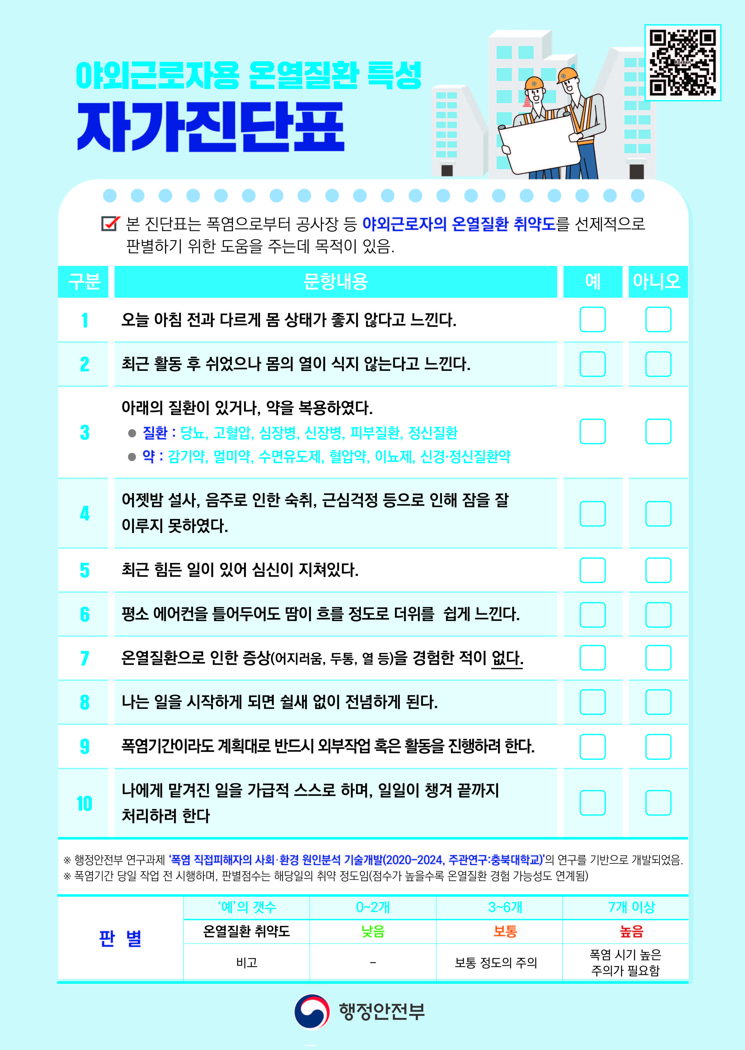 행정안전부에서는 2022년 폭염 종합대책의 일환으로, 폭염으로부터 공사장 등 야외근로자의 온열질환 취약도를 선제적으로 판별하는데 도움을 주기 위해 '야외근로자 온열질환 특성 자가진단표'를 개발하였습니다.